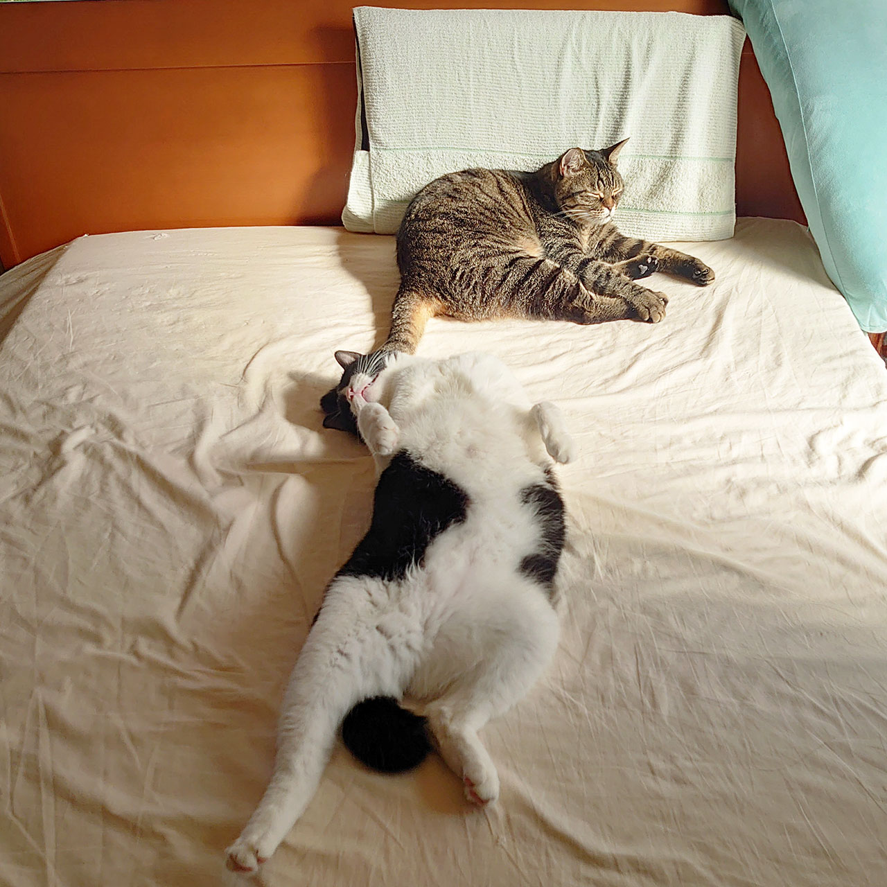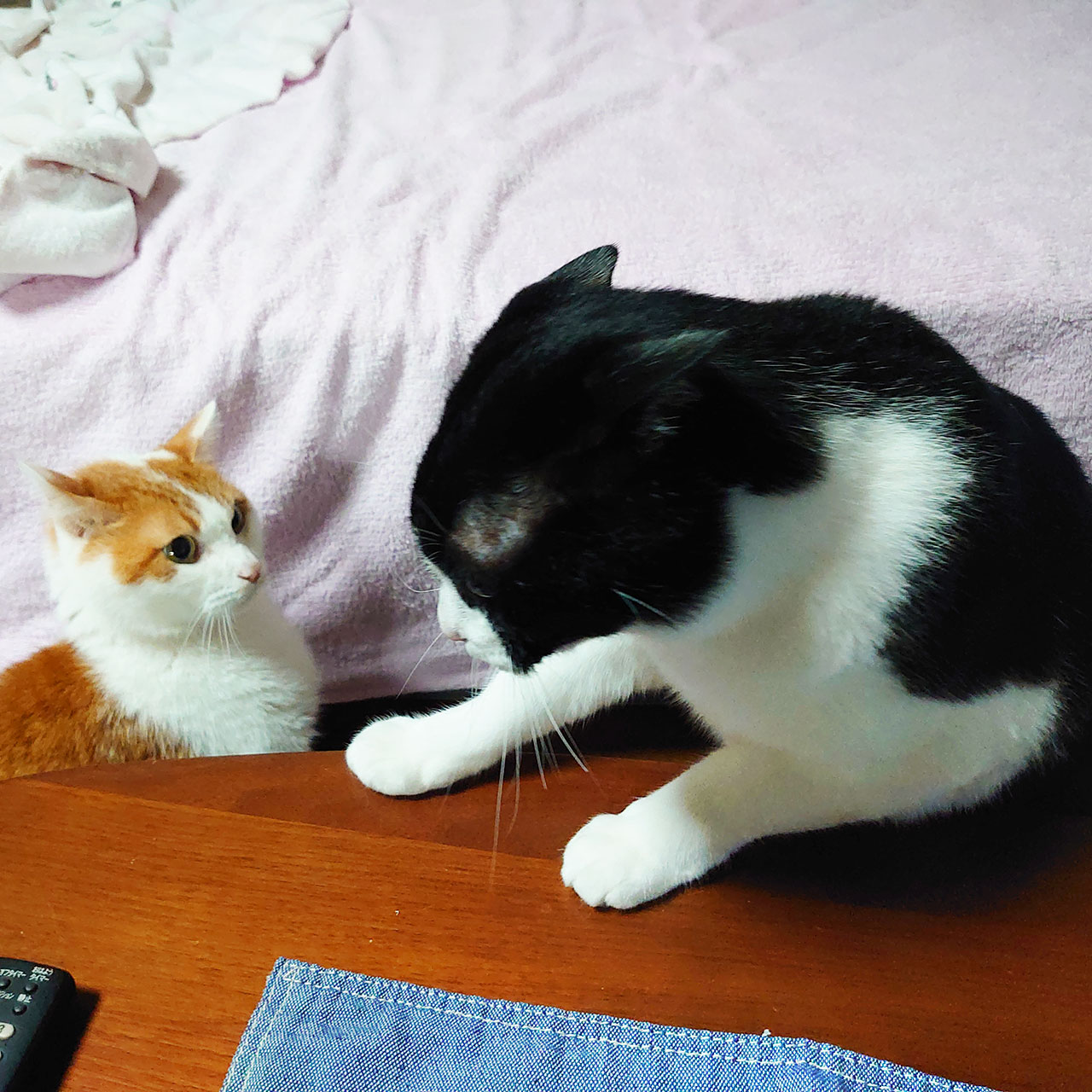 もちおはヨリが怖いらしくてヨリの前だとまるで別猫のようにオドオドしてます。