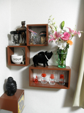 じゃ、お花が危険にさらされそうなので壁の飾り棚にそっと飾ることにしました◎