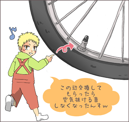 なんかパンクじゃなくて空気入れるとこの部品が傷んでいたらしくて交換?してくれた模様です。