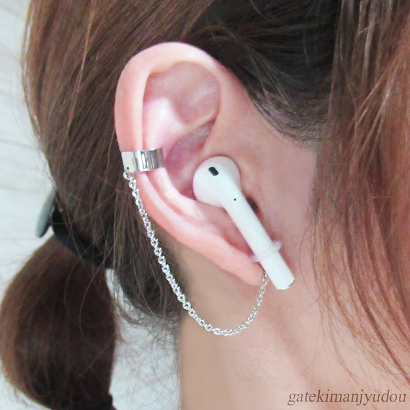 ワイヤレスイヤホンにはめる部分とイヤーカフスをチェーンで繋いだアクセサリーです。